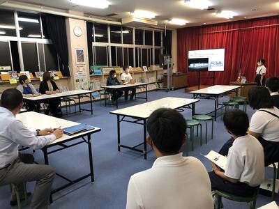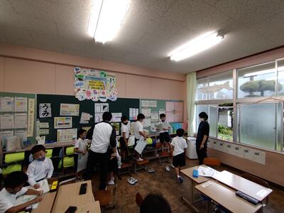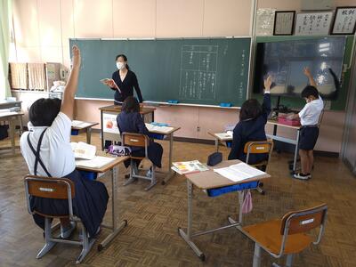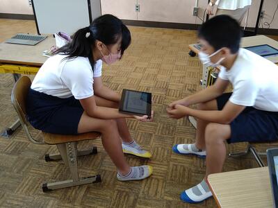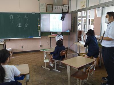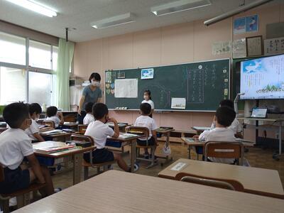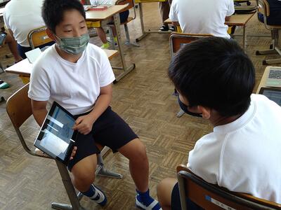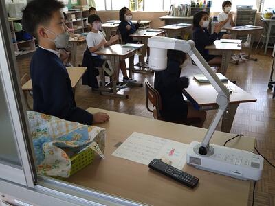 今日は、天草市教育委員会の先生、御所浦中学校の先生、東京からの学生さん(キャラバン隊)が来校されました。2時間目の5年生の国語の授業では、タブレット端末に自分の考えを残しながら、話し合いが行われました。児童は、緊張しながらも話し合いが少しずつ活発になっていく姿が見られました。緊張の中での授業、これも大切な経験です。
