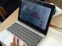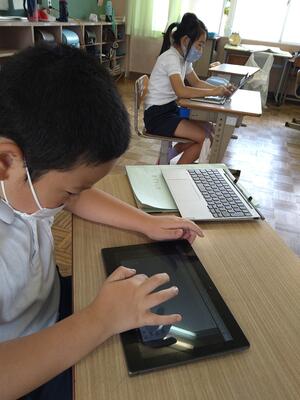 タブレットに社会科の校外学習の質問を打つ練習です。