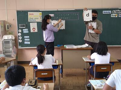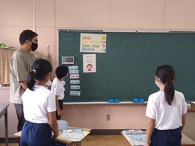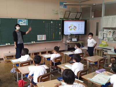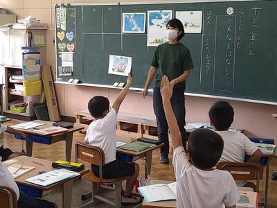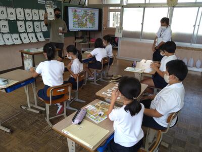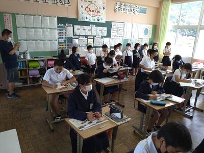 天草市では1年生から外国語に慣れ親しみます。3、4年生は外国語活動、5,6年生は外国語科として学習を進めています。
