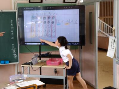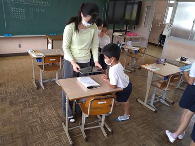 既習の算数の問題を使い、タブレットの画面を使って説明していきます。