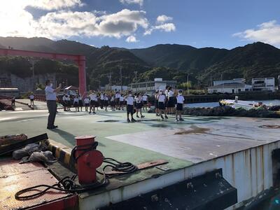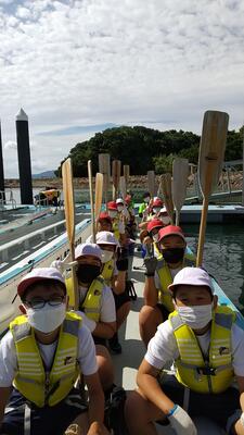4年生は、勇志国際高校近くの入り江で伝馬船の体験を行いました。地域の方々のご協力をいただきながら、全員が艪をこいで舟を進める貴重な経験をしました。風が吹く中での操縦は容易ではなく、悪戦苦闘しながらも和船ならではの操船を体感することができました。 ※伝馬船(てんません)とは、日本で使われた木造の小型和船で、本船と岸の間で荷物や人を運ぶために用いられた船です。