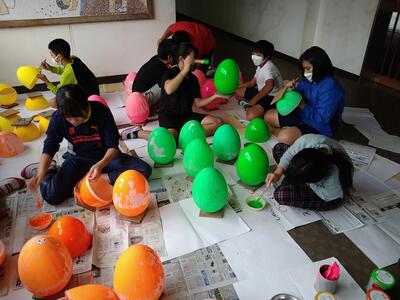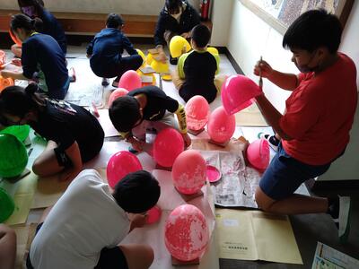 六時間目です。イルミネーション点灯式の飾り付けで使う「恐竜の卵 The eggs of dinosour」を蛍光色のポスターカラーで塗りました。毎年この時期の年中行事です。さあ、どんな飾り付けとなるのでしょうか!乞うご期待ください。この写真の後、ピンクのしぶきが舞う事態が・・・。