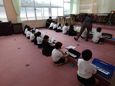 授業のようすです。階段を上がっていくと鍵盤ハーモニカの心地よい響きが・・・