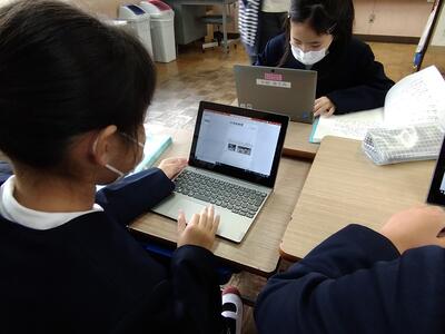 4年生は、総合的な学習の時間です。タブレットで、2学期の「御所浦の海の交通の歴史」や「伝馬舟体験」などを新聞にまとめていました。