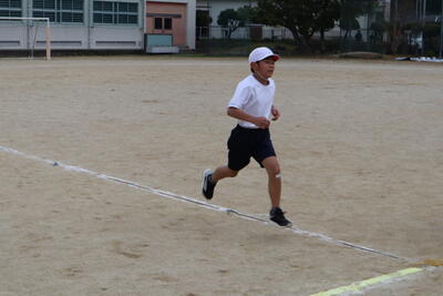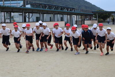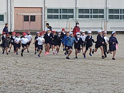 3・4年生はマラソン大会のコース練習。北風の強い中、力強い走りです。