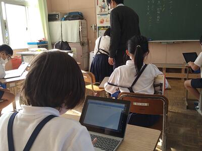 4年生は、社会科の学習です。「天草といって思い浮かべることやものもの」を子どもたちがどんどん出していきます。「天草五橋」「崎津協会」「リップルランド」・・・インターネットを使って調べて、「ああ、ここ知ってる!」「○○にいく時にとおりました」