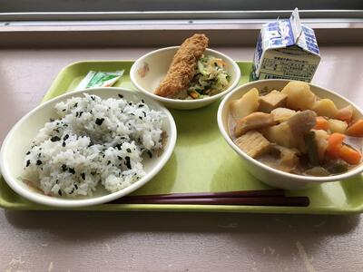 今日は、クリスマス給食です。今日は冬至でもありますね。パンプキンチキンスープ、セレクトケーキそして天草大王の唐揚げ、ゆずごまサラダ、ミルクパンでした。季節感たっぷりの給食です。