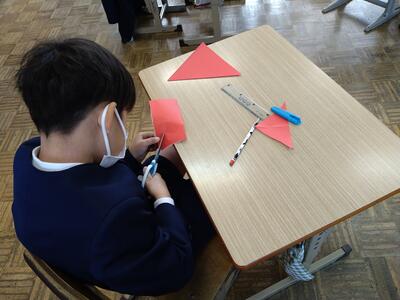 3年生は、算数の時間。みんなで折り紙を折って、正三角形を作っていました。