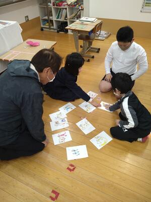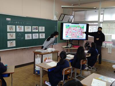 4年生は外国語活動の時間です。今日は学校の部屋の名前を使って活動します。