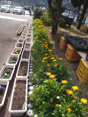 さて、正門の様子です。金盞花 クリサンセマム パンジーの花が咲いています。