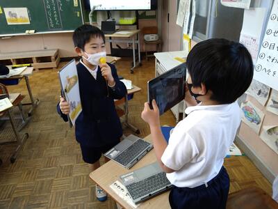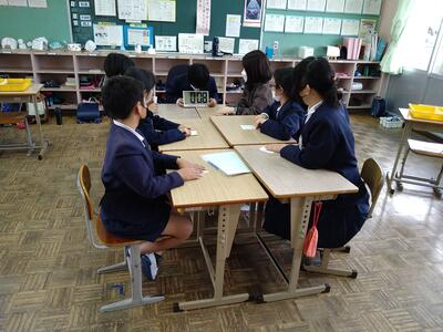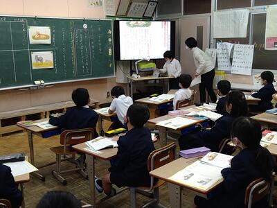 今日は、天草市教育委員会の先生、御所浦中学校の先生、東京からの学生さん(キャラバン隊)が来校されました。2時間目の5年生の国語の授業では、タブレット端末に自分の考えを残しながら、話し合いが行われました。児童は、緊張しながらも話し合いが少しずつ活発になっていく姿が見られました。緊張の中での授業、これも大切な経験です。