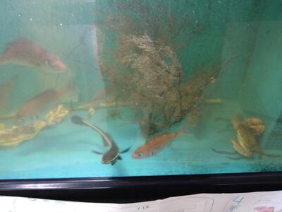 今日は3年生がえさをやる日でした。まんべんなく魚たちにエサをやるのも工夫が必要です。エサに突進してくる魚。沈むのを待つ魚。他の魚に遠慮する魚?・・・いろいろいます。「コバンザメに~!!」