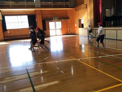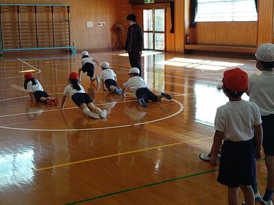 体育館では1年生がとび箱の学習です。今日は授業始まってすぐでしたので、ウォーミングアップをかねて、とび箱を手で支える運動として「あざらし」を行っていました。みんな見事なアザラシでした。