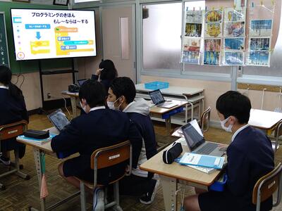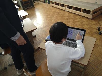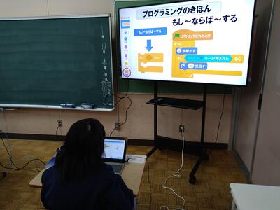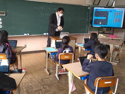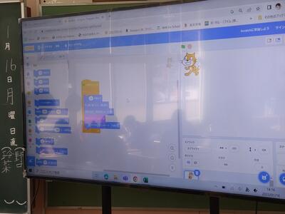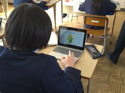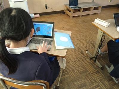 1年生は、午後からプログラミングの学習です。昔のパックマン(古いかなあー)を指示を出してイメージどおりに動かします。パクパクさせるためには、「口を開き」「口を閉じ」「口を開き」「口を閉じる」のくり返しを命令します。