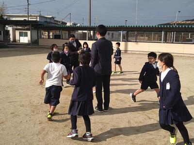 運動場では、異学年でサッカーを楽しんでいる子供たちがいます。