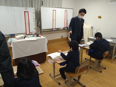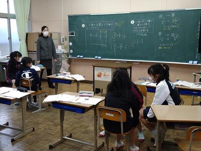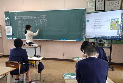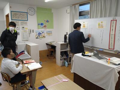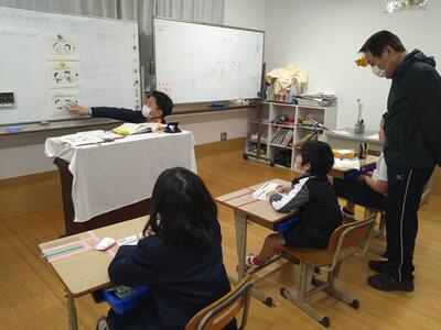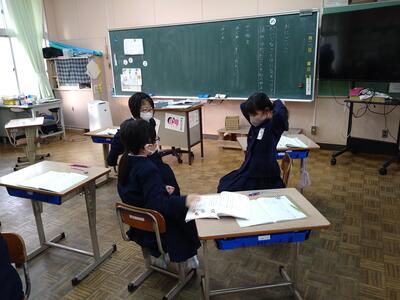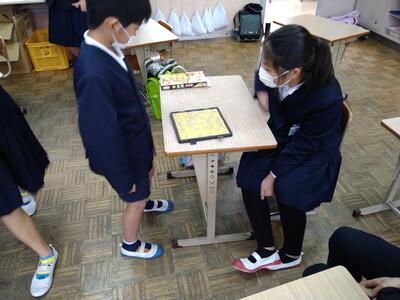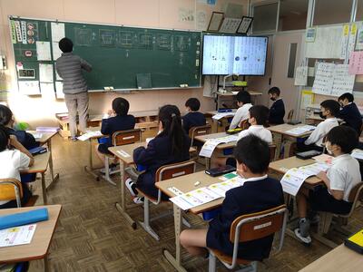 4年生は国語の学習。熟語のつくり、例えば「軽重」は反対の意味を合わせた熟語など熟語のつくりを話し合いながら分類していきます。子どもたちが迷っていたのが「岩石」。「いわいし?」「人の名前?」「ああ、いわ と いし かー!」楽しんで考えながら熟語のつくりを考えていました。