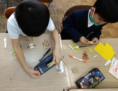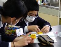 お互いに、「こうだよ」「金具をはめるって書いてあるよ」など話し合いながら実験キットを作っていました。