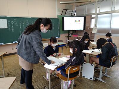 3年生は、国語。アリの行列を読んで書いた感想を相互評価します。
