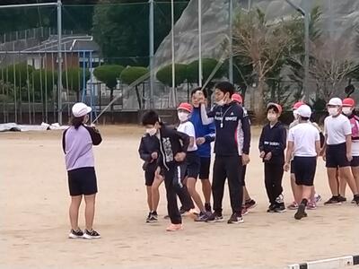5年生は、長縄跳びとハードル走の練習。ハードルもリズムよく跳んで走っていました。