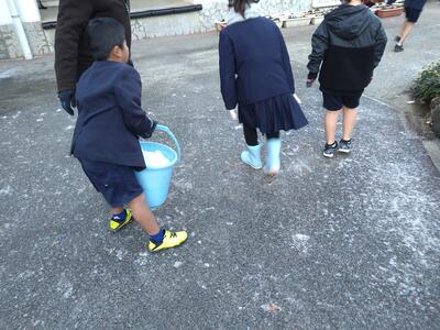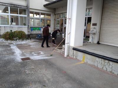 子どもたちの登校前、職員で児童玄関前が凍結して、ツルツルでしたので、氷をくだき、お湯をかけ、氷を溶かします。