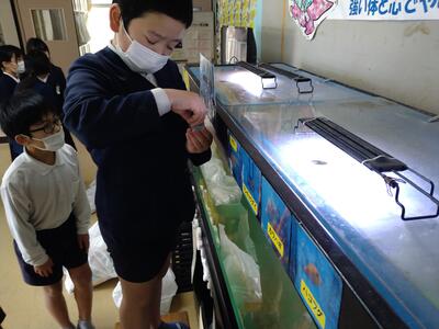 ②下は、御所っ子水族館のえさやりです。珍しい魚を見るだけではなく、学年ごとにえさをやり、魚たちに親しみます。