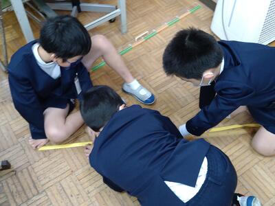2年生は、1mを越す長さの測り方を、1mものさしやその他のものさしなどを使って考えていました。