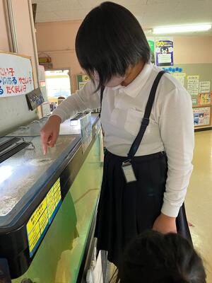 御所浦小学校 学校版環境ISOの一つにも「ごしょっ子水族館を大切に扱う。」があります。その活動の一環として、学年ごとにえさやり体験をしています。昼休みは、4年生によるごしょっ子水族館のえさやり体験でした。