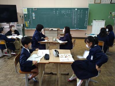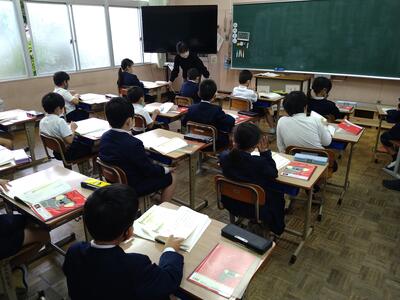 今日は、天草市教育委員会の先生、御所浦中学校の先生、東京からの学生さん(キャラバン隊)が来校されました。2時間目の5年生の国語の授業では、タブレット端末に自分の考えを残しながら、話し合いが行われました。児童は、緊張しながらも話し合いが少しずつ活発になっていく姿が見られました。緊張の中での授業、これも大切な経験です。