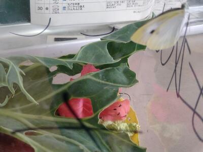 3年生教室をのぞくと、虫かごが数個並んでいます。中を覗くとモンシロチョウが!!