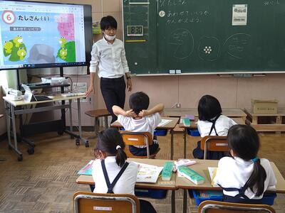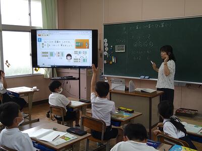 1年生教室、算数のたし算中。新しいことを楽しく学ぶ、大切ですね。