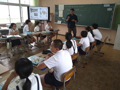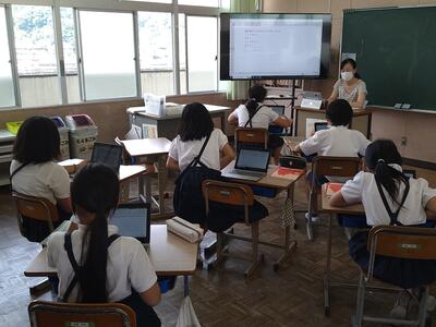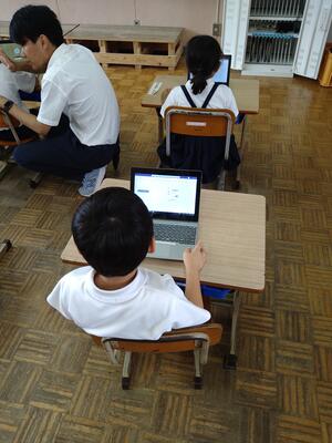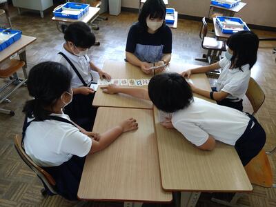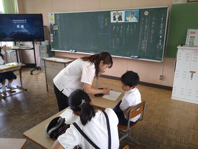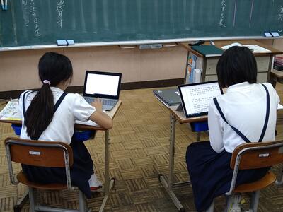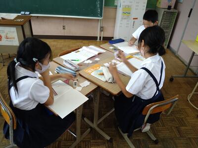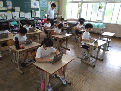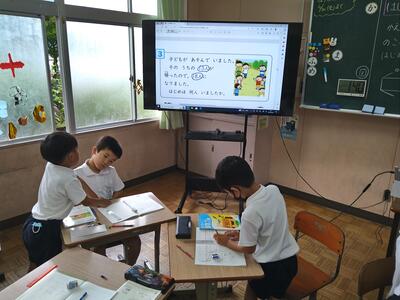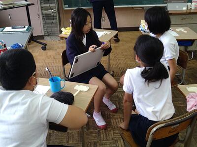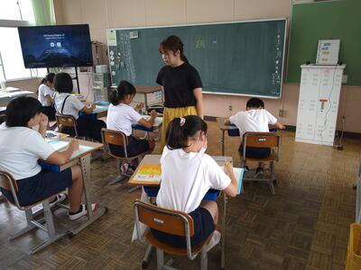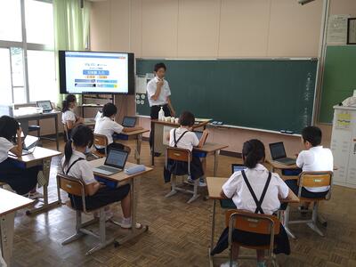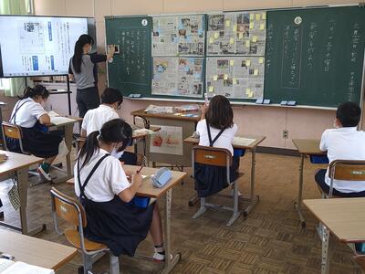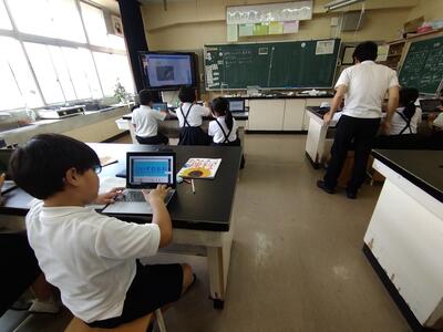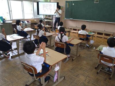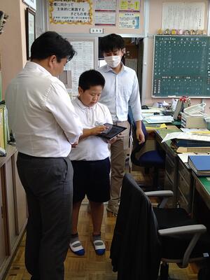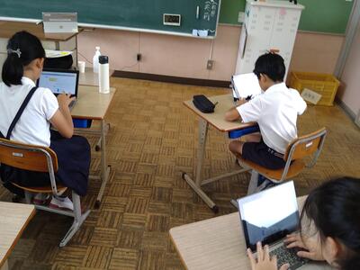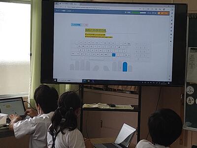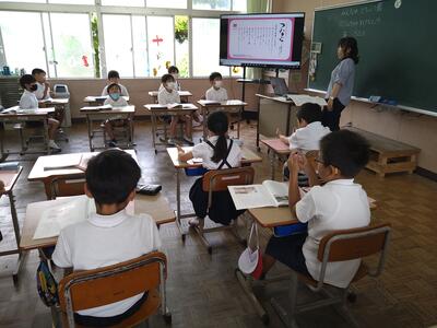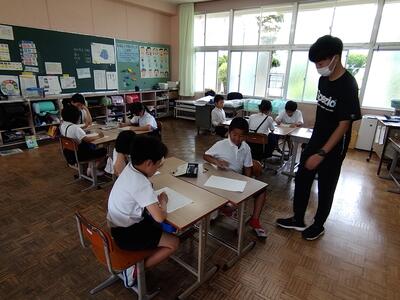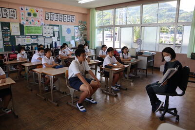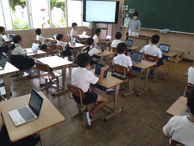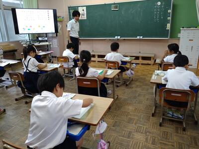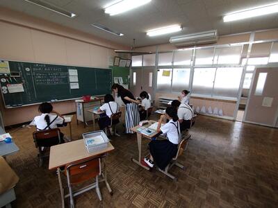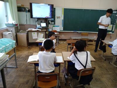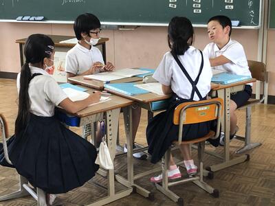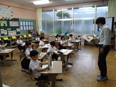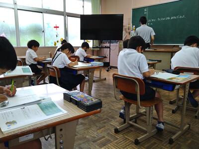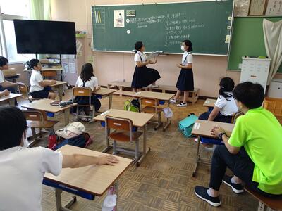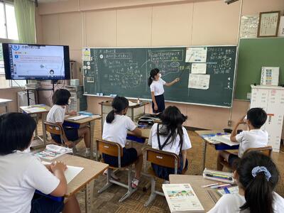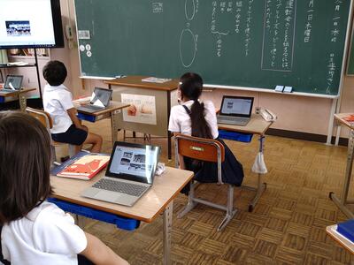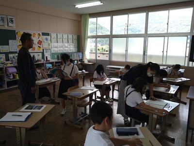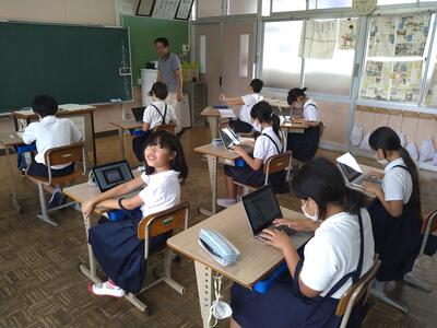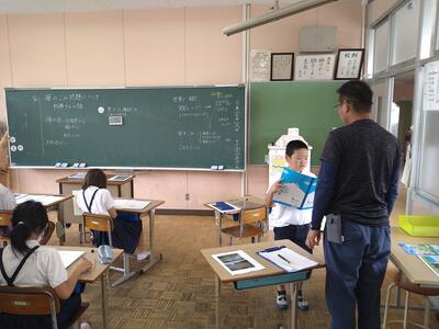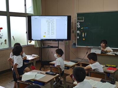 今日は、天草市教育委員会の先生、御所浦中学校の先生、東京からの学生さん(キャラバン隊)が来校されました。2時間目の5年生の国語の授業では、タブレット端末に自分の考えを残しながら、話し合いが行われました。児童は、緊張しながらも話し合いが少しずつ活発になっていく姿が見られました。緊張の中での授業、これも大切な経験です。