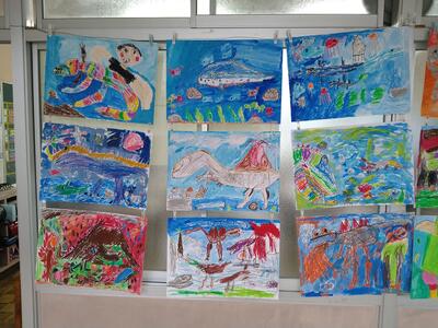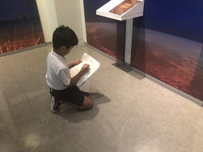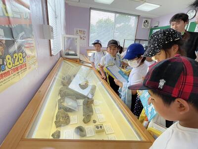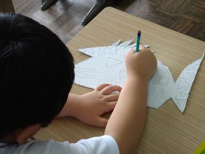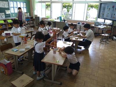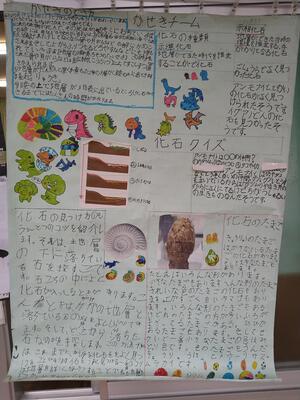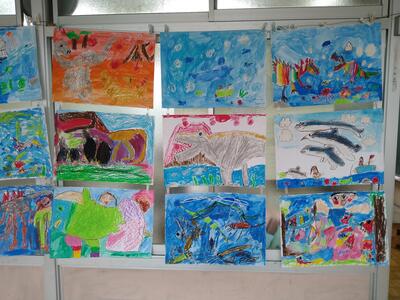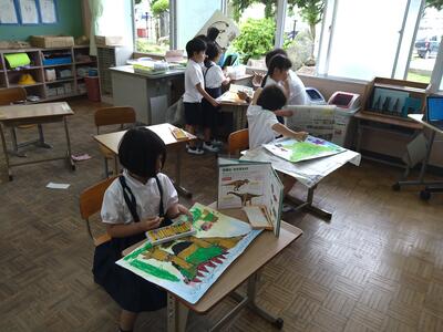 1年生は、恐竜絵画の仕上げも行っていました。「これは、たまご」「校長先生、私のも見てください」