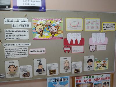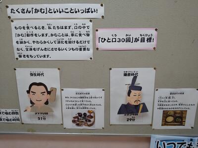 さて、保健室横には歯の健康に関する掲示。「かむ」ことの大切さについて、子度もったいも給食をとりに配膳室にきたときによく読んでいきます。