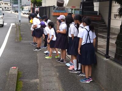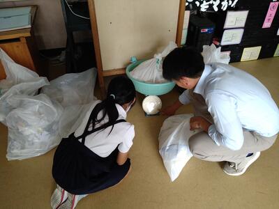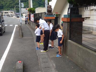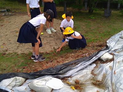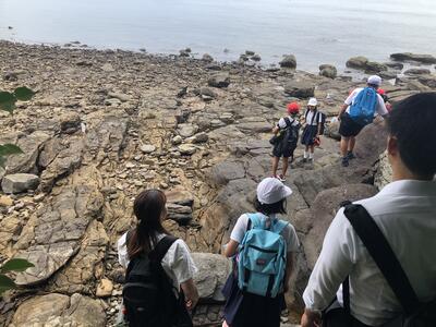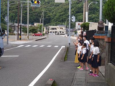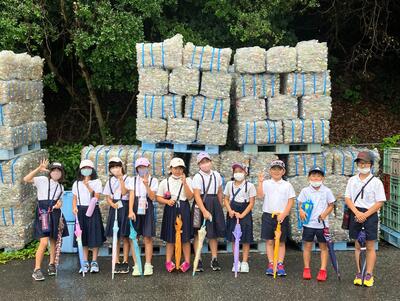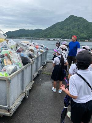 7月23日(水)、御所浦小中合同でボランティア活動を実施しました。中学校の生徒さん方がリードしながら、自分たちの地区で清掃活動に取り組みました。お菓子の袋やペットボトルなどのゴミを拾い、御所浦の環境をさらにきれいにしてくれた子どもたちです。ちなみに、写真の奥に見えるのは八代海です。遠くには九州山地も、うっすらと姿を見せていました。美しい景色と捨てられたゴミの対照が、なんとも印象的でした。