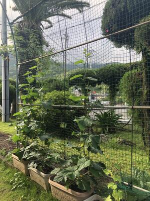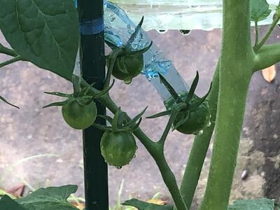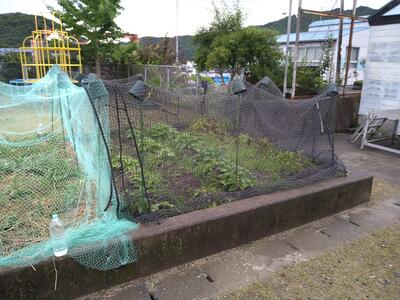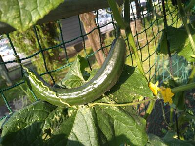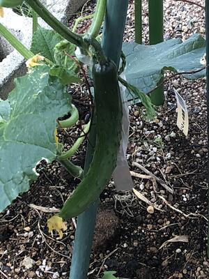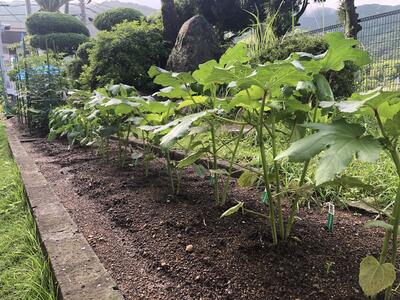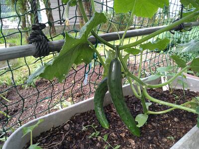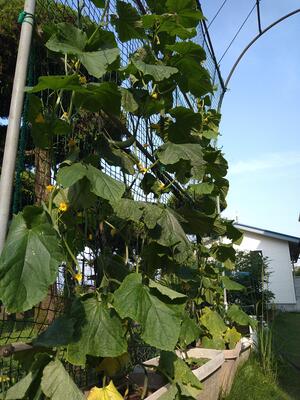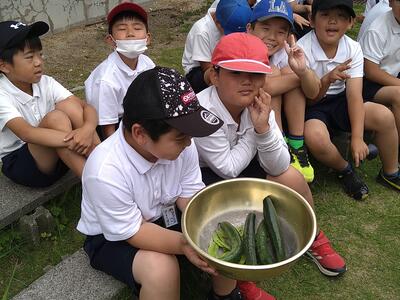 さて、生活科園をあさからのぞいてみると。こんなキュウリが数本。この前見たときは2cmぐらいしかなかったので、あっという間に大きくなりました。