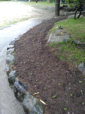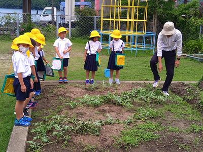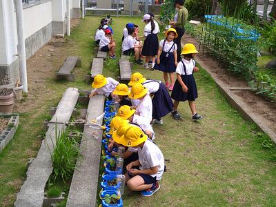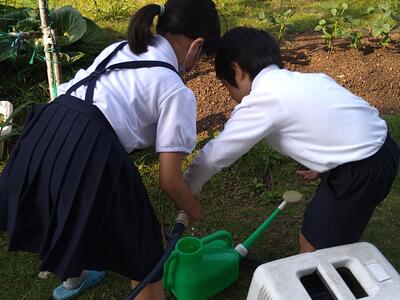 1年生は、アサガオに「おおきくなーれ」と愛情と一緒に肥料を与えていました。