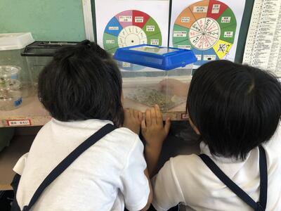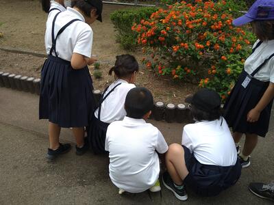 3年生は理科の学習。昆虫をさがし、どんなところにいたのかをまとめていきます。ありがはちを運んでいるところを発見!