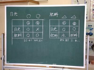 5年生も理科の学習。下のように植物の成長には何が関係しているのかを条件を変えながら実験をしていきます。