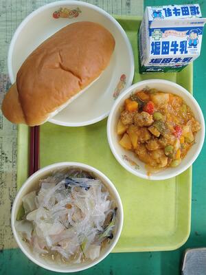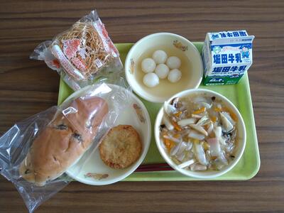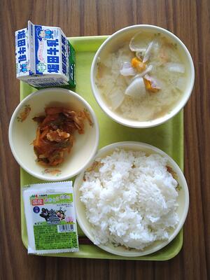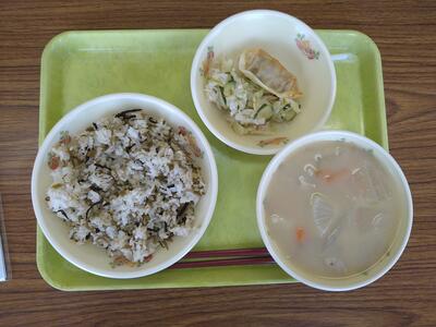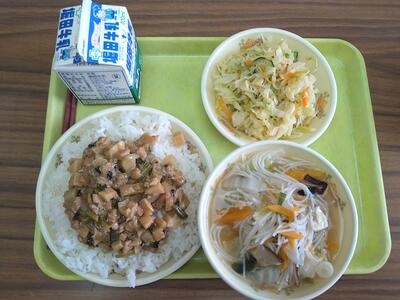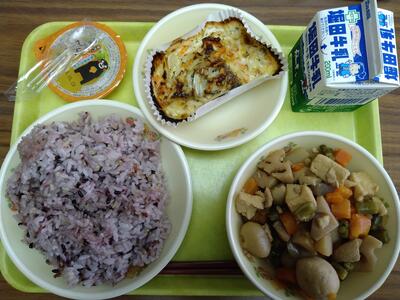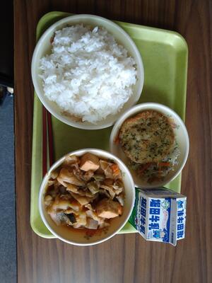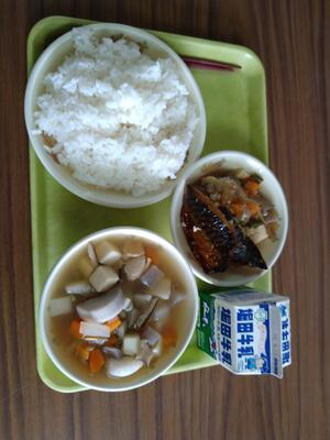 今日の給食は鯖のてり焼き、こんにゃくと厚揚げのそぼろに、そしてつぼん汁です。