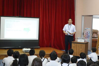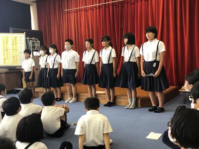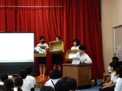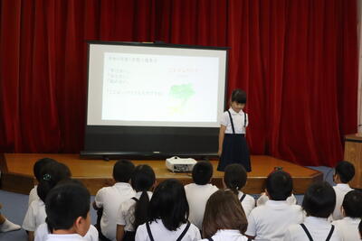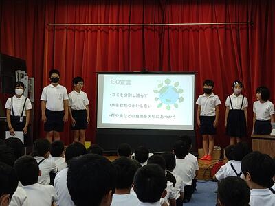 今日の朝の活動は、委員会発表。環境委員の皆さんが学校版環境ISO宣言についての説明や一年間の取組について紹介してくれました。