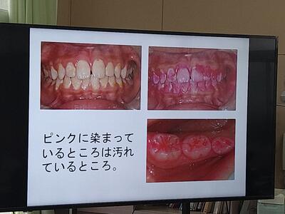 歯の染め出しで、自分の歯磨きの仕方や磨き残しの状況について把握します。