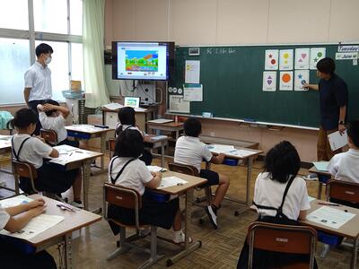 3年生は外国語活動の時間です。今日は「I like blue]」好きな色と好きな形を英語で学習。