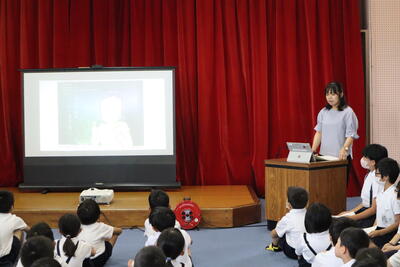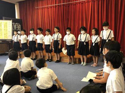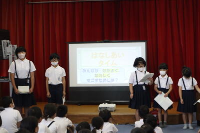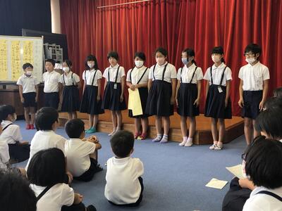 人権集会を行いました。人権主任の先生方からは、「自分のよいところに目を向けてみよう」というお話がありました。その後、縦割り班に分かれ、子どもたちは、友達のよいところをハート型の台紙に書き込んでいたものを手に紹介しました。誰のことが書かれているのか分からない班の友達は、発表を聞きながらドキドキしています。名前が明らかになると、紹介された子は嬉しそうに言葉を交わし、温かな雰囲気が広がりました。子どもたちが体育館を後にしたあとも、会場にはいつもより柔らかく、温かい空気が残っていました。