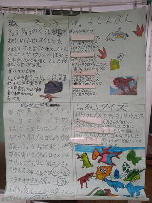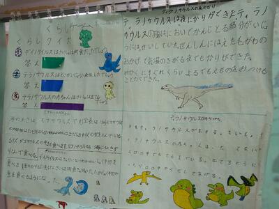 さて、2年生教室には、出来上がった恐竜絵画が・・・どれもステキな恐竜たちです。