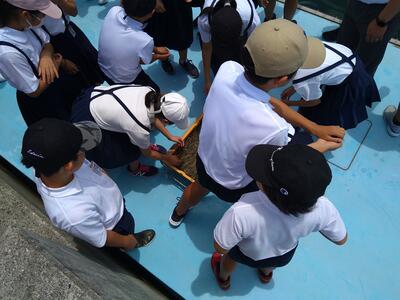 これまでヒラメや車エビの稚魚放流を経験させていただきましたが、今日はマダイの放流を体験しました。稚魚のつかみ方にも慣れてきたのか、これまで以上にスムーズに放流できていたと思います。