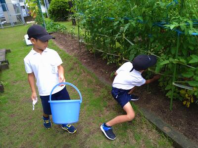 さて、朝の生活科園です。2年生の子どもたちが夏野菜の収穫中です。