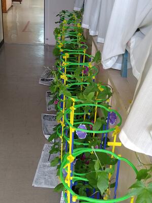 大雨の予報も出ていましたので、1年生のアサガオは室内に避難中でした。