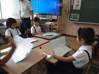 さて、今日の授業のようすです。1年生は公民館長さんが授業の助っ人に来てくださって、「おおきなかぶ」の音読グループ練習です。担当を決めて、気持ちを込めて・・・