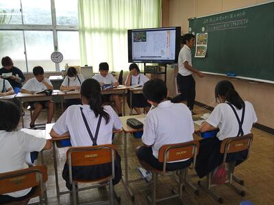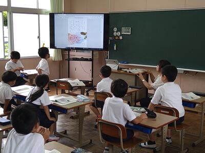 まずは3年生の国語です。本校は、先生方がよくICT機器を使って授業をされます。