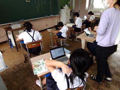 3年生。総合的な学習の時間の見学でまとめたことを写真に撮って、先生のパソコンに送っています。(提出しています。)その後、画面上に並んだ友だちの考えと自分の考えを比較しながら共有していきます。